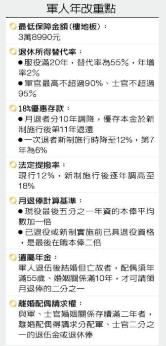 台湾公教团体的年改去年已经完成了,最棘手的军人年改20日“三读”通过后也将在今年7月1日上路,尽管楼地板确定为3万8990元(新台币,下同),但包含所得替代率、18%优惠存款等都受到了影响。