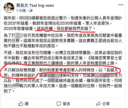 蔡英文不仅自认把台湾从“可见危机当中拉回来”,还说她如今面对的种种责难“正是过去政治人物不愿也不敢推动年改的原因”,但只有她“从来没有任何犹豫”,更炫耀“这些(破产)危机,现在都被我们克服了”。