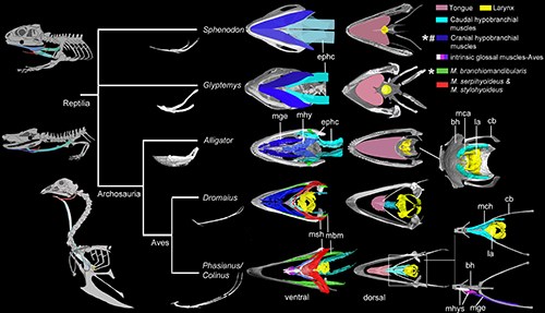 基于恐龙、翼龙和现代鳄鱼、鸟类之间的亲缘关系,该项工作比较了恐龙、翼龙、短吻鳄和现代鸟类的舌骨及相关肌肉,以及这些性状在不同谱系中的演化趋势。比较解剖的研究工作主要通过利用杰克逊学院高精度X-射线断层扫描以及增强CT造影所获取的高精度图像以及三维重构完成,对比标本包括了大量的现代标本的舌骨,分别来自3个短吻鳄以及13种现代鸟类(鸵鸟、鸸鹋、鸭子和鹌鹑);还包括11个化石种类的舌骨,这些化石主要来自中国的热河生物群,包括小型的似鸟恐龙、翼龙甚至暴龙,由于舌骨在化石中的保存较为罕见,这些标本完好的舌骨显得尤为珍贵。