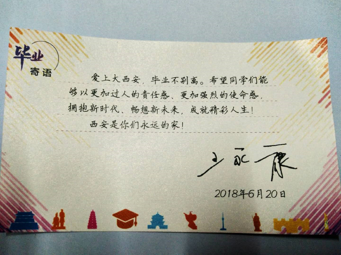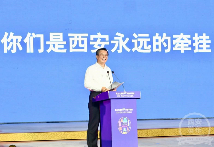王永康书记说,毕业不仅是校园生活的结束,更是创新创业的开始,这个伟大的新时代,大西安这座伟大的城市,正需要一大批创业英雄。希望大家站在毕业的新起点,共享大西安大机遇,大胆创新,艰苦创业,实现梦想。