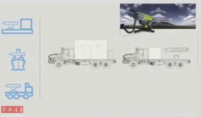 如图所示,Şahi-209轨道炮全系统可集成到两辆集装箱卡车上,或是搭载到海军战舰上进行机动作战,具有较强的作战灵活性。