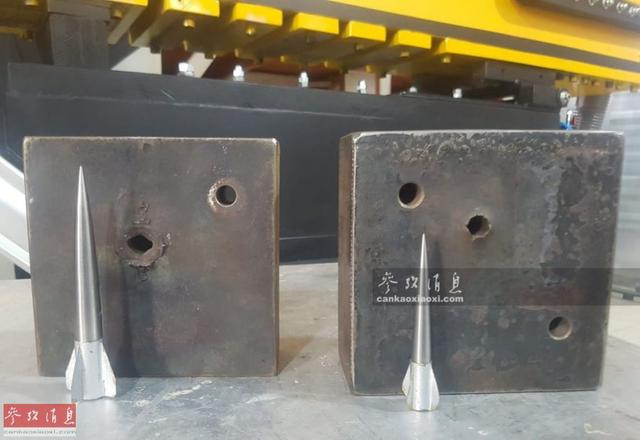 图为被轨道炮击穿的厚钢板,可见三个弹孔。