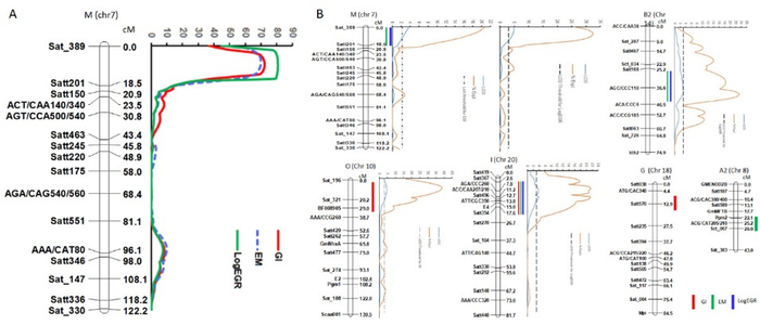 图2 调控北方根结线虫(A)和南方根结线虫(B)的虫癭指数(GI)、卵块数(EM)和卵数量(LogEGR)的大豆主效基因的分布及调控