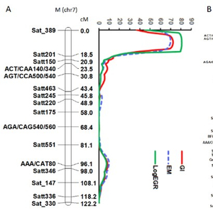 该研究同时首次建立了利用幼苗生长袋进行大豆孢囊线虫的繁殖培养和快速抗性筛选方法(Nematology,2018),此方法能够实时观察线虫的发育状况(图1)。并与东北地理所大豆分子育种学科组研究员孔凡江进行合作,利用其研究的大豆开花期基因的自交重组群体首次对北方根结线虫进行了数量性状(QTL)遗传分析,发现了一个主效基因调控虫瘿指数、线虫卵块数量和卵数(图2A);同时首次分子证实了调控南方根结线虫的虫瘿指数和线虫繁殖由不同的基因调控(图2B),所鉴定的分子标记能够加速大豆根结线虫的抗病育种(Nematology,2018)。此外,与加州大学河畔分校关于棉花根结线虫的超亲遗传抗性合作研究也取得进展,揭示了超亲遗传抗性机制并建立了遗传模型(Frontiers in Plant Science, 2015,2017),培育出了同时抗线虫和真菌的多抗棉花种质资源(Phytopathology,2018)。