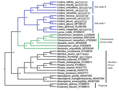 樟科山胡椒属树种经济用途广泛。山胡椒属多数种类的种子富含脂肪,可供制皂及工业油用,如油料植物山胡椒(Lindera glauca);不少种类富含芳香油,可制香料及药用,如中草药三桠乌药(Lindera obtusiloba);一些种类的木材有香气,可供家具及文体用品等用,如缅甸著名木材黄金樟的树种山香果(Lindera metcalfiana)。然而,目前对于山胡椒属的物种界定是否合适尚存争议,尤其是山胡椒属、木姜子属和月桂属等的系统关系还不明确。中国科学院西双版纳热带植物园博士研究生赵美丽及其合作者在副研究员宋钰和研究员徐增富的指导下,利用32种樟科植物的叶绿体基因组探讨了山胡椒属植物与其它10属植物的系统关系。