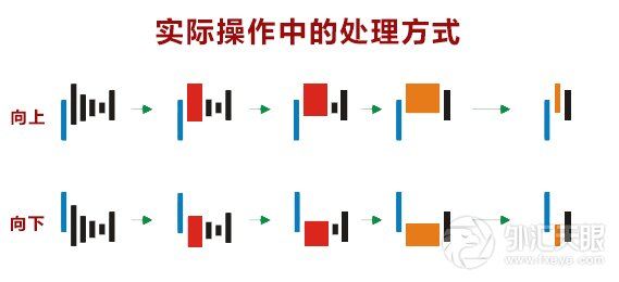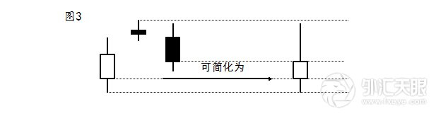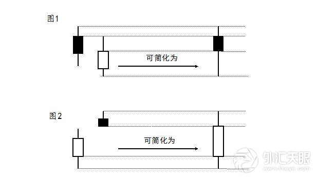 在实战中,有些时候对于连续出现的几根K线图也许不容易识别其意义,我们可以进行简化处理。简化合并的方法是: