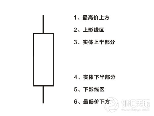 如下图,如果我们把单日K线分成6个多空力量争夺的区域。那么,多空双方争斗的区域越高,越有利于上涨;多空双方争斗的区域越低,越有利于下降。