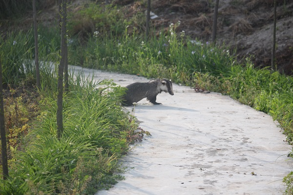 此外,园区内安装了十余个摄像头,捕捉狗獾的踪影。起初,生态园从山东引入了4只人工饲养的狗獾,尝试将其野生放养。如今,栖息地的各人工洞穴中均有狗獾生存,并自行扩大了洞巢,种群数量已有30只左右。这证明他们已经认可并适应了这样一个环境。