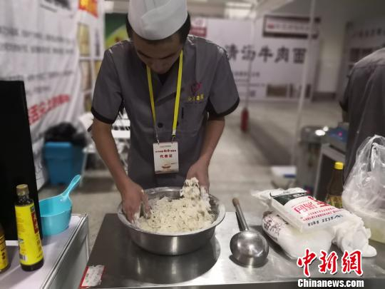 6月23日,2018中国面条博览会在兰州拉开帷幕。图为宁夏手工臊子面展位上,厨师正在用擀面杖擀面。 杨娜 摄