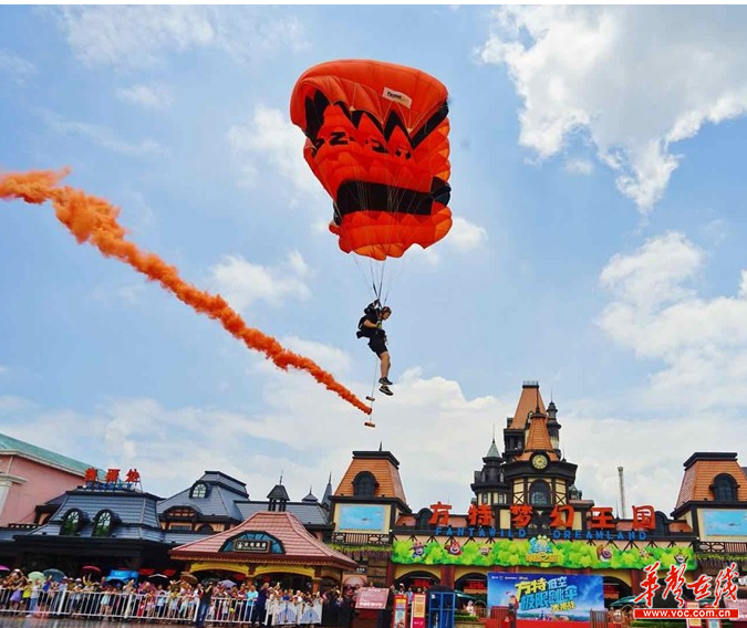 6月23日,株洲方特梦幻王国广场,跳伞爱好者在上空表演低空跳伞。摄影记者 徐行