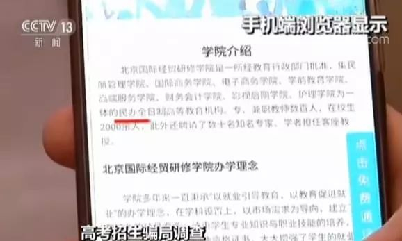 据了解,目前北京市教委对民办非学历的教育机构进行的招生监测,主要的方式为教育机构自行向北京市教委上报招生广告和招生简章,由教委审核同意后使用。有教育学者就指出,北京国际经贸研修学院利用微信公众号和手机移动浏览器玩起的文字游戏,正是一种新型的招生骗局。