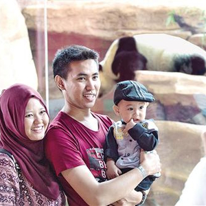 中国大熊猫“彩陶”和“湖春”自2017年9月份抵达印尼以来,受到了印尼社会各界的广泛关注。如今,“彩陶”、“湖春”已成为印尼野生动物园当之无愧的明星动物。图为在印尼茂物野生动物园,一家三口以大熊猫“湖春”为背景合影。 (新华社发)