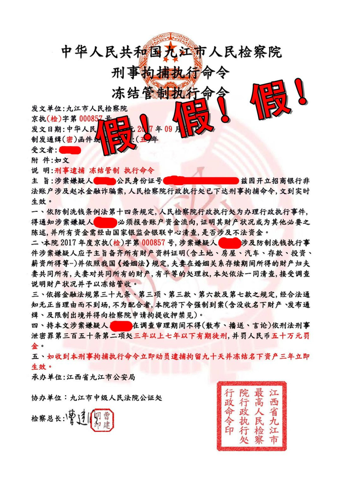 6、警察证、逮捕证、通缉令等。政府、公检法机关工作人员在工作过程中,不会将自己工作证件照片发送给嫌疑人;公检法机关工作人员不会在网络上向嫌疑对象发送通缉令、逮捕证等法律文书,如果真的涉嫌犯罪,不可能仅凭几通电话,公安机关一定会登门拜访。