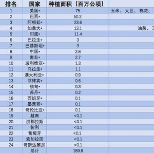 这24个国家中有19个为发展中国家,5个为发达国家。发展中国家的种植面积为1.006亿公顷(占53%),发达国家的种植面积占47%。
