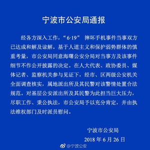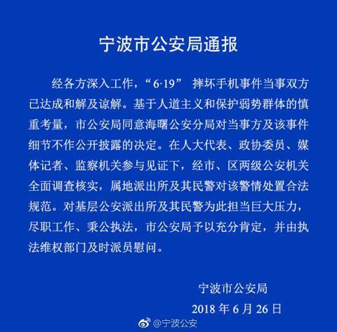 据“宁波公安”最新消息,“6·19”摔坏手机事件当事双方已达成和解及谅解。