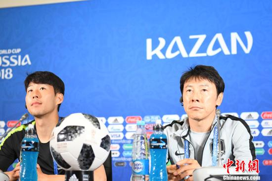 当地时间6月26日,韩国队主帅携孙兴慜在喀山体育场亮相赛前发布会。6月27日,韩国对阵德国的世界杯小组赛即将在下诺夫哥罗德进行。 中新社记者 田博川 摄