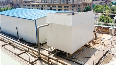6月22日上午,记者来到小区,在业主李先生家看到,窗外有一间蓝白色的活动板房,紧挨着活动板房的是一个中央空调冷却塔。这个冷却塔发出“嗡嗡嗡”的低频噪声,即便是关上窗户,依然听得很清楚。另一位业主王女士告诉记者,她在小区已经入住了5年,自从冷却塔被搁置在3层楼顶,她家南面的房子就没有办法住人了。王女士说,从楼顶加盖了活动板房开始,业主们通过各种渠道向政府职能部门投诉。因为小区是城改房,城改办的规划部门前来认定了楼顶的活动板房为违法建设,但被认定违建后还是无人去执行拆除。而且被环保部门责令要拆除的冷却塔也没有拆除。