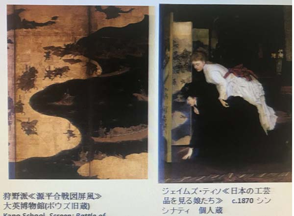 在詹姆斯·蒂索(James Tissot)一张《注视日本工艺品的年轻女子》的作品中所绘的日本屏风,就来自于如今大英博物馆所藏的狩野派《源平合战图屏风》;同样英国V&A所藏的威廉·尼斯菲尔德(William Nesfield)用日本艺术品做成的屏风也展示出了日本艺术的影响。但在马渊明子看来,这些日本工艺品对西方艺术的影响是有限的,他们往往只是画面中的创作元素,这也只是“日本主义”影响西方的初级阶段。