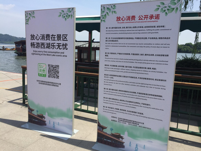 为方便游客及时了解,这八项承诺以中英双语的形式被统一印刷在展板上,放置于游船内。每条游船上还贴有二维码,游客可扫码了解该船的过往服务、投诉情况。“若乘船时遇到商家违规操作,可直接拨打牌上投诉电话。市游船公司承诺一旦发现船工有侵权游客行为直接开除。”杭州市市场监管局上述负责人表示,下一步,“放心消费活动”还将在湘湖、西溪湿地、千岛湖等景区推广。
