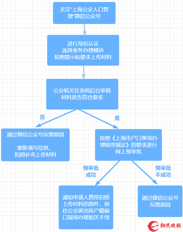 申请人关注“上海公安人口管理”微信公众号后,进行身份认证,选择业务办理模块,按照提示和要求上传材料。材料上传成功后,公安机关将在系统后台审核材料是否符合要求。对不符合要求的,将通过微信公众号向申请人反馈原因,提醒申请人重新填写信息、拍照补充上传材料;对符合要求的,将按照《上海市户口事项办理程序规定》的要求进行网上预审批,网上预审批通过的,通知申请人携带拍照上传材料的原件,前往公安派出所户籍窗口现场办理相关手续;网上预审批不通过的,将通过微信公众号向申请人反馈原因。