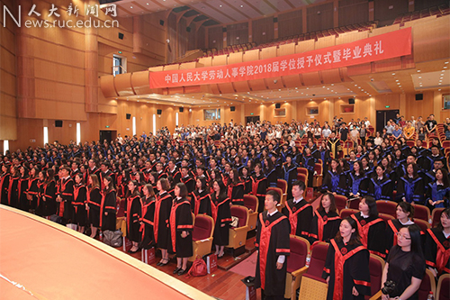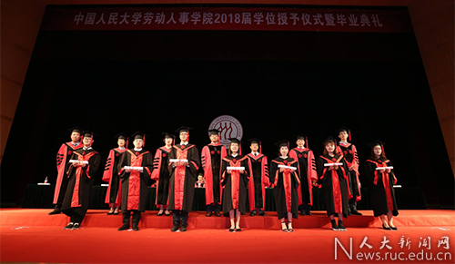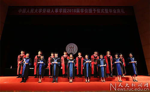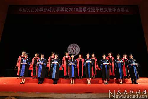 中国人民大学学位评定委员会应用经济学分会副主席、劳动人事学院院长杨伟国宣读《中国人民大学学位评定委员会关于授予学士学位、硕士学位的决定》:劳动人事学院2018届毕业生中122人获得管理学学士学位、42人获得经济学硕士学位、381人获得管理学硕士学位。