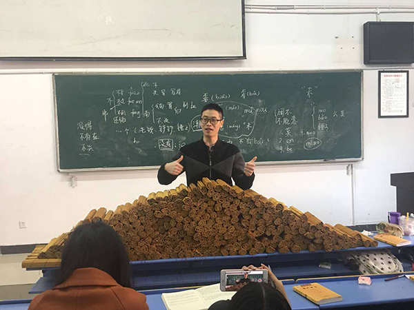 如何让这些学生真正喜欢上古代汉语,是李福言一直在思索的,“我知道学习古代汉语肯定有枯燥的地方,所以我就要求自己尽力把课上得有意思。”课上,李福言会结合学生们的家乡话来讲解保存在方言中的古语,也会布置一些有趣的“体验式”作业,竹简便是其中之一。“一个是竹简,还有一个是小篆,我希望他们能通过在《说文解字》中一个字一个字的查找,看每个字的小篆写法、构造是什么,来熟悉小篆的字形和结构。”