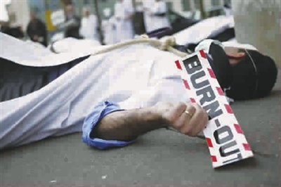图说:一名美国医生在游行活动中,手举“燃尽”的标语倒地,抗议工作压力过于沉重 图GJ