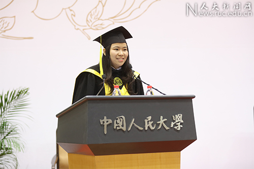 博士毕业生代表乔婧思向母校、恩师、家长、同学表示感谢。“当我们走出校园时,人大给予我们终身取之不尽的精神宝库,将指引我们在更广阔的天地间不倦求索。” 她表示,身为人大人,在人大培养了实事求是的精神和坚忍不拔的态度,践行了勇于创新、敢于担当的拼搏精神,学到了胸怀宽广、团结务实的人生态度。希望大家在接下来的人生路上,力争成为“国民表率、社会栋梁”,为祖国的繁荣发展贡献力量。