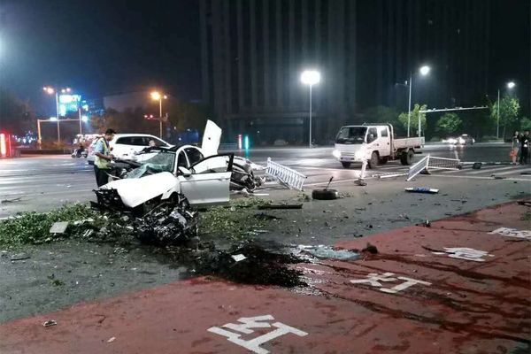 事故发生在午夜零时左右,一辆白色轿车沿金穗大道自西向东急速行驶,在即将通过与新二街十字路口时失控,车辆冲入主干道右侧绿化带中,径直撞上信号灯杆。