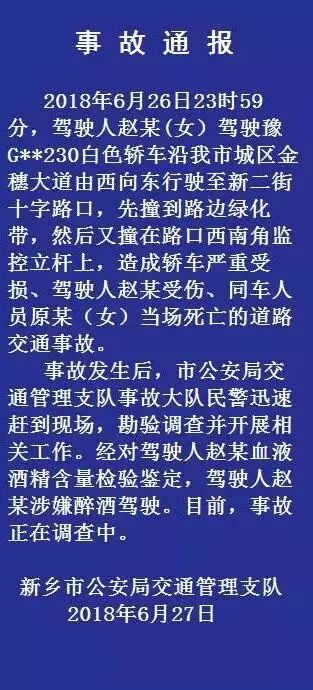 新乡市交通管理支队相关负责人告诉告诉大河报·大河客户端记者,该起事故为单方事故,女司机赵某驾车失控后撞向信号灯杆,事故造成一名乘车人死亡,车辆报废。警方已经对女司机进行抽血化验,赵某涉嫌醉酒驾驶,目前警方正在进一步调查此事。