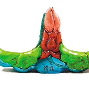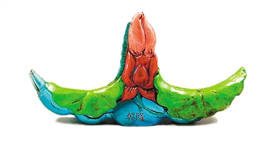 笔者收藏有一只清代笔架山,材质为琉璃,以荷花形态进行展示,造型还是山字,中间突出,两边顺势翘起,长10.5厘米,宽2.1厘米,高5.7厘米,底部呈蓝色的为水波,水波之上,有两片荷叶搭在笔架山的肩上,中间突出部分有两朵荷花,一朵为深红色,娇艳欲滴,另一朵为粉红色,含苞待放。在底部边缘,有“乾隆”二字,注明制作年代,这种展现荷塘美景的笔架山不是很常见。由于年代稍远,琉璃已经失去部分光泽,但其气度和神韵仍在,令人想起宋代诗人杨万里的诗句,“接天莲叶无穷碧,映日荷花别样红。”应时应景,极富美感。