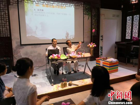申文辉在古猗园教游人制作清仙纸莲花。 陈静 摄