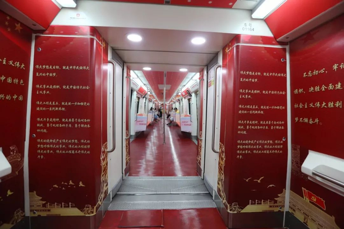 “新时代号”是长春地铁首个十九大主题宣传车厢,主题车以红色背景为主色调,展示了与党的十九大主题相关的30多条标语和国旗、党徽、华表等标志性建筑,将地铁打造成流动的“新时代传习所”,方便市民出行的同时,也从不同角度展示宣传了十九大精神,把十九大精神传递给每位乘客。