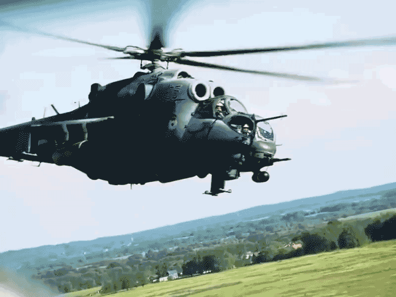 较为罕见的机位角度,为安装在机头双23毫米航炮上的摄像机,可见米-35M的机头特写,以及机头下方的光电瞄准转塔。