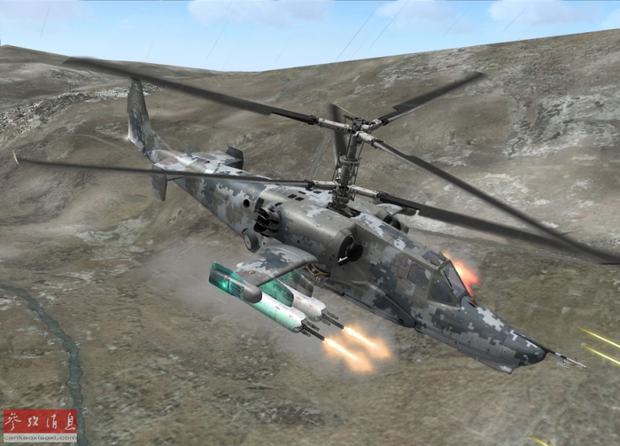 图为飞行模拟游戏中的俄军卡-50武直使用GUV-8700航炮吊舱齐射开火的截图。