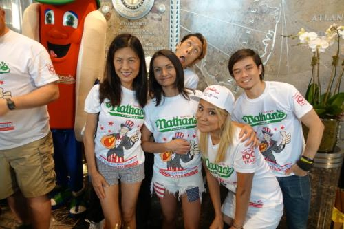 李蕙(左一)、须藤美贵(右一)等人为吃热狗大赛热身。(图片来源:美国《世界日报》记者 金春香 摄)