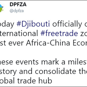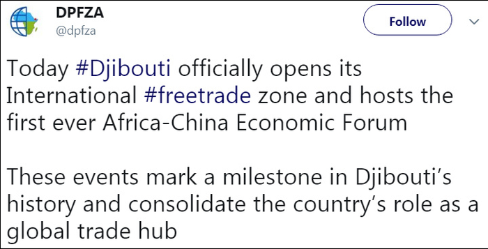 此外,上述官方推特还表示,吉布提国际自由贸易区将很快成为非洲最大的自由贸易区之一。