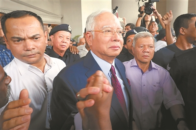 四日,前总理纳吉布(中)离开法院时向支持者致意。 新华社/美联