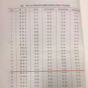 省社科院经济研究所副研究员武文超介绍,与去年相比,河南的省辖市郑州、洛阳和焦作的综合实力排位保持不变,南阳(第5位降到第8位)、鹤壁(第14位下降到第18位)和信阳(第23位下降到第24位)排名出现较小下降,其余省辖市均实现上升。