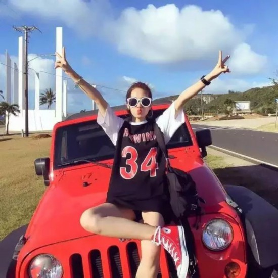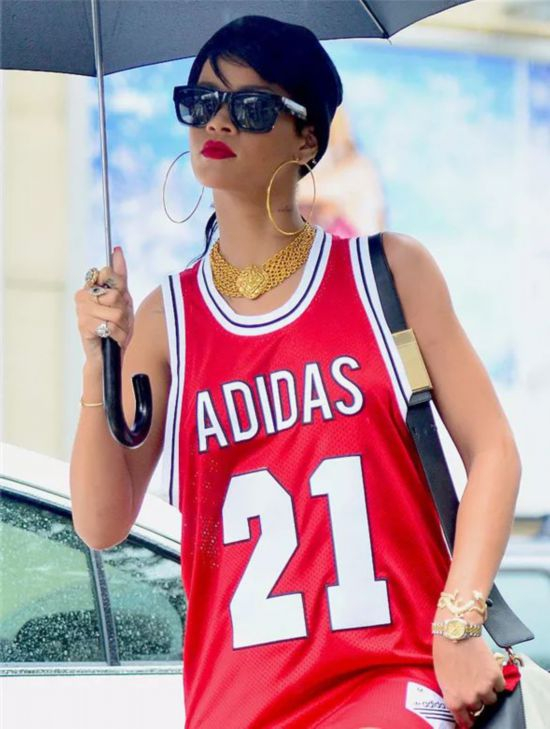 红色的篮球衣,配上大金饰,霸气十足地耀眼。加上RiRi拽上天的红唇,就要成耀武扬威四个字。
