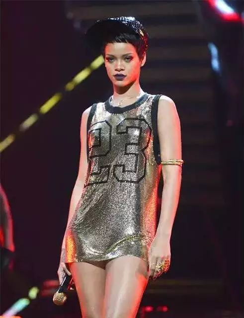 裙子前短后长的设计,又为RiRi加了柔美。谢谢RiRi让我们又看到了球衣的另一种可能:走红毯。
