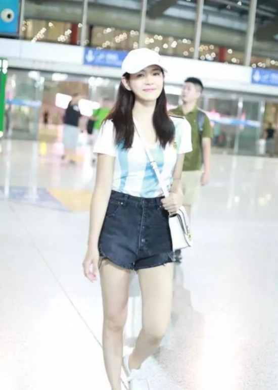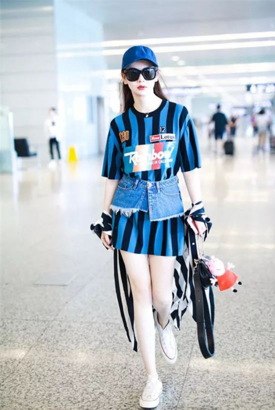 戚薇绝对是球衣爱好者,德国的10号球衣搭配牛仔小短裤青春感十足。长袜、小白鞋的搭配,满满的少女气息。