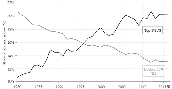 从图1可以看到,美国最高收入1%人群与低收入50%人群的实力对比在全球化启动后出现反转,1996年极富者的收入占比决定性地超越低收入者,并继续飙升,而低收入占比则一路下滑。这个自我强化的分配不均过程发展到金融危机前后,已经造成所谓“顶层收入尾部上翘”现象,在最富有的1%群体中,收入梯度进一步向超级富豪倾斜,顶层劳动收入获得者与顶层资本收入获得者的重合度迅速上升。有研究认为,顶层0.001%人群的收入增长是最富1%收入增长的三倍以上,而2017年美国最富有的3个人的财富总和已经超过低收入50%人群的财富。