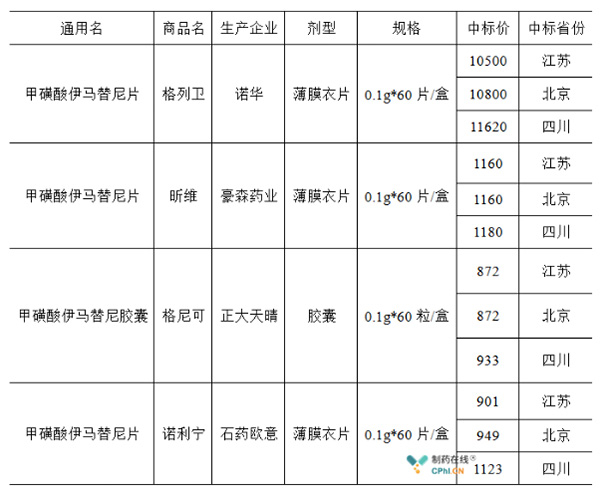 进口与国产甲磺酸伊马替尼在江苏、四川、北京的中标价对比