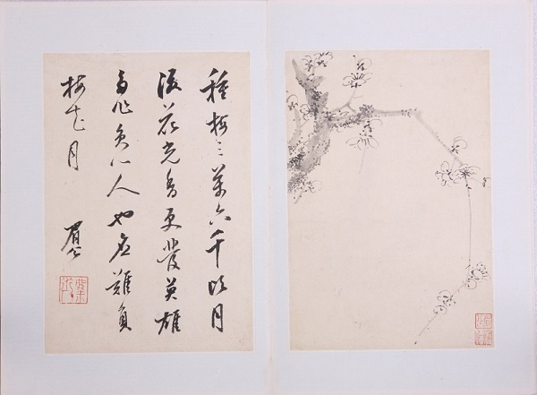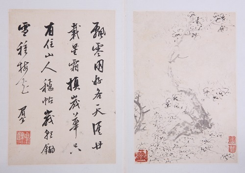 另外一件则是明代后期重要书画家陈继儒的《梅花诗画册》。此册共计12开,梅花诗与梅花画册各六开,其中六页折枝墨梅,涉笔草草,各尽其态,显示了作者深厚的写生功力。