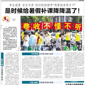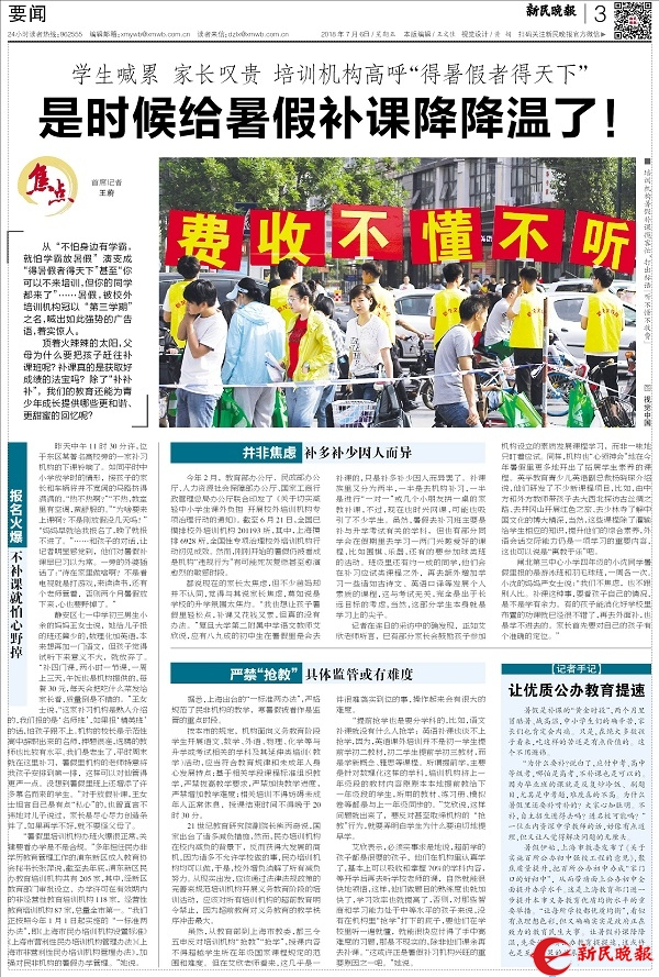 7月6日,本报焦点新闻曾刊发《学生喊累 家长叹贵 培训机构乐呵呵 是时候给暑假补课降降温了!》,剖析了培训市场乱象。市教委也多次强调,民办学校在招生录取过程应兑现不提前开展报名和面谈等工作、招生不收取各种特制的学生个人简历及各类获奖证书、招生录取不与任何社会教育培训机构挂钩“三个承诺”。这一要求也写入各区招生入学工作政策。