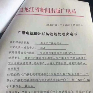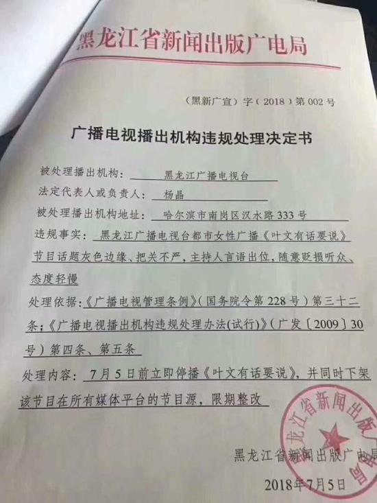 澎湃新闻(www.thepaper.cn)记者7月8日中午从黑龙江广播电视台方面有关人士处获悉,该台旗下知名女性情感生活类节目《叶文有话要说》,近日被黑龙江省新闻出版广电局认定违规,并勒令在7月5日前停播,同时下架该节目在所有媒体平台的节目源,限期整改。