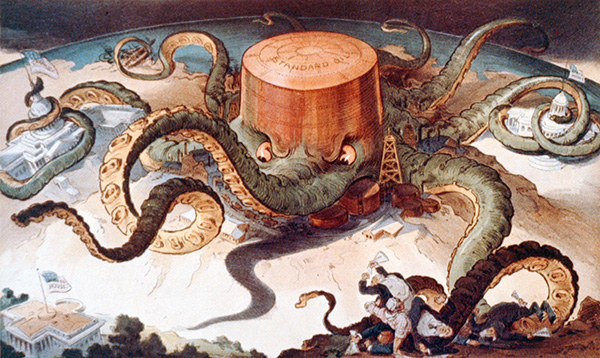 1938年美孚石油的地质学家为什么会来中国呢?美孚石油背后是洛克菲勒家族。老洛克菲勒逐渐垄断了北美的石油开采,以及石油的炼化、运输,变成了国家背后一股重要的政治经济力量,这副漫画暗示美国国会和白宫都在他的控制之下。