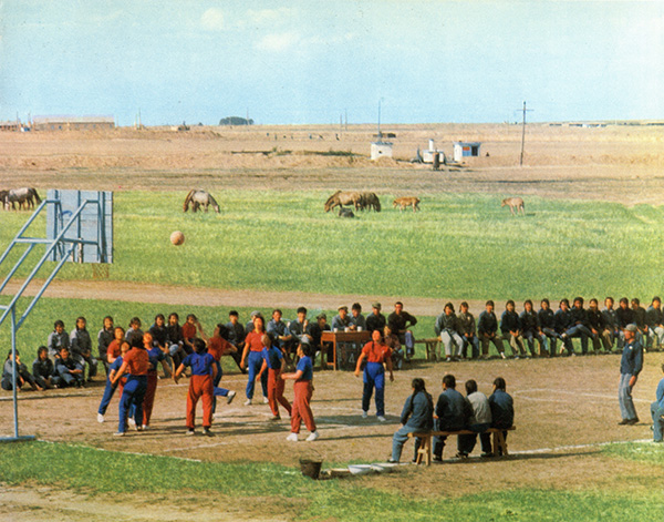 这是最有代表性的大庆矿区场景,工人——很明显是受过良好教育的知识青年——在打球,远处是田园风貌,牛羊在放牧,旁边是油井。