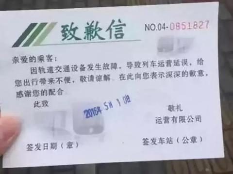 3、地铁发生故障后,会有地铁公司的致歉信。此外,乘客如需要向单位证明迟到原因,可通过网上下载“延误告知”,不必在车站当场索取致歉信。